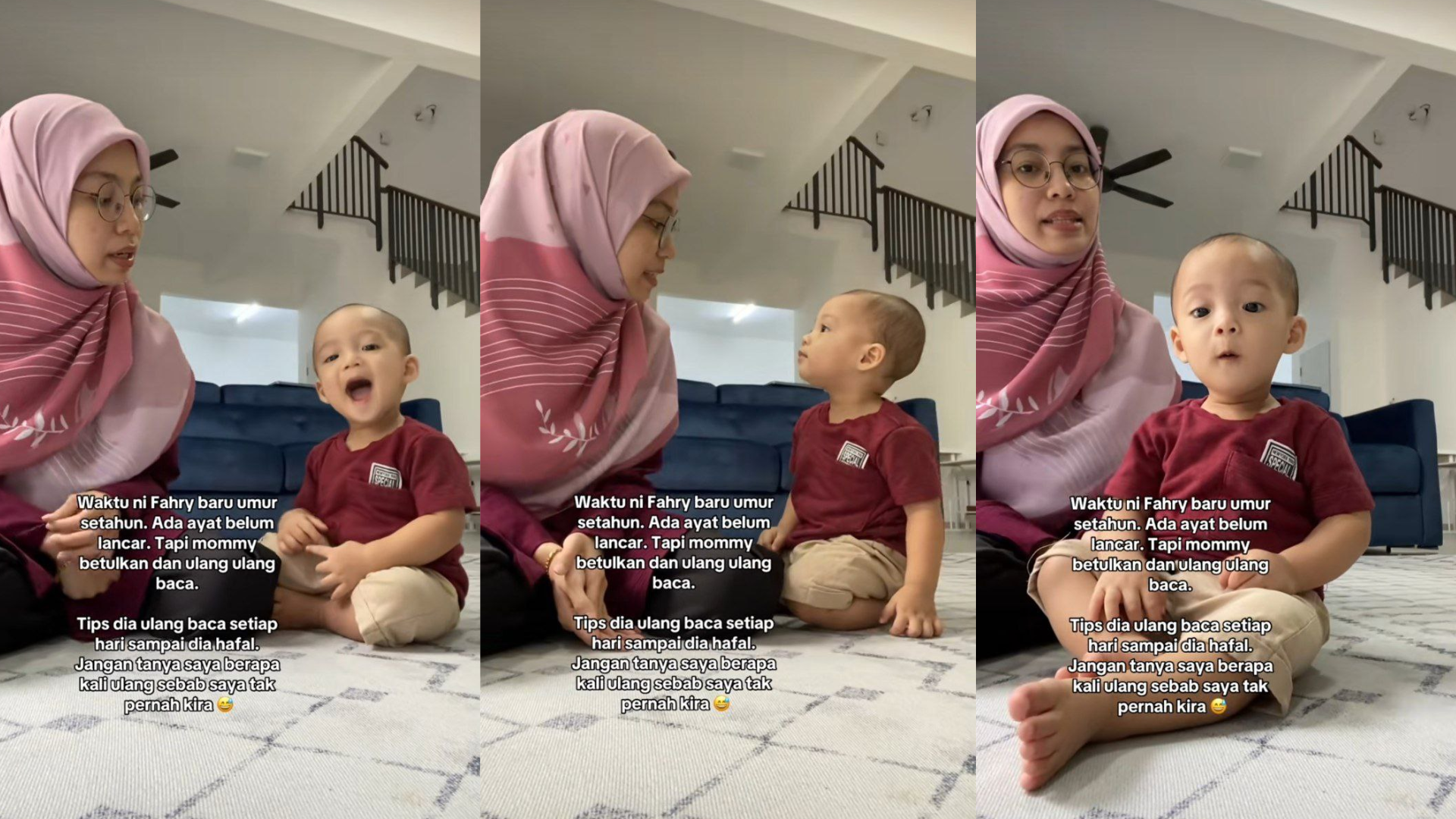 “Sejujurnya rasa tak layak nak kongsi tips ini tapi saya kongsi apa kami praktiskan dengan Fahry. Sejak dari lahir kami dah biasakan dia dengan bacaan surah lazim setiap hari.