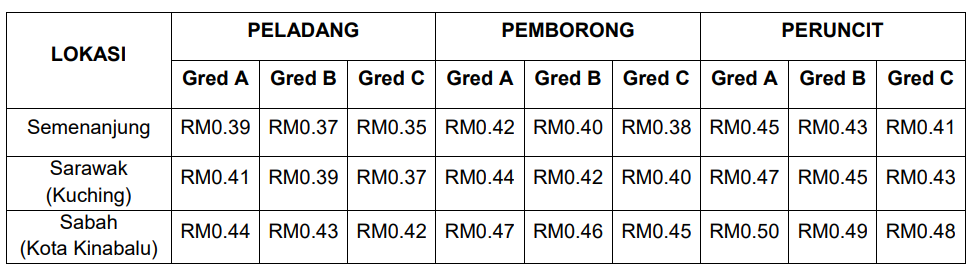 “Sekarang ini untuk telur gred C adalah 35 sen sebiji, gred B (37 sen), dan gred A (39 sen).
