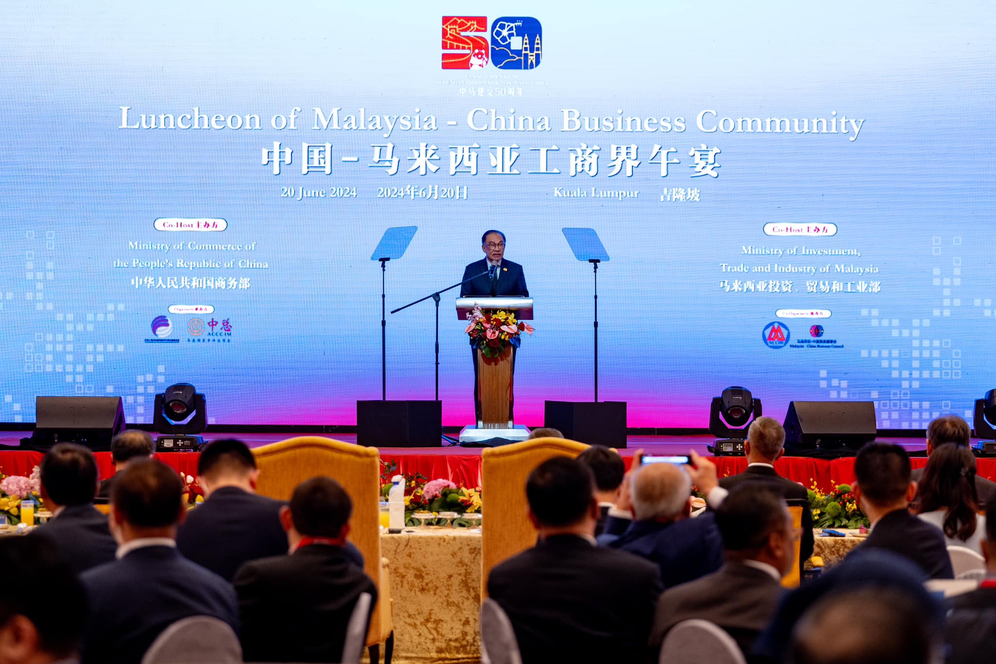 Perdana Menteri Datuk Seri Anwar Ibrahim ketika di Majlis Makan Tengah Hari bersama Premier China Li Qiang serta komuniti perniagaan Malaysia-China di Hotel Shangri La, Kuala Lumpur.