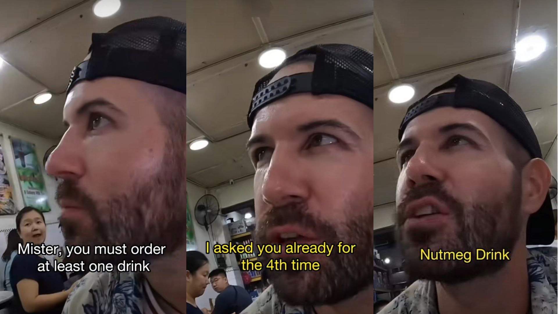 Di awal video itu, Carlos telah bertanya tentang minuman tersebut kepada beberapa pekerja di kafe itu, namun mereka menjawab dengan ekspresi keliru dan mengangkat bahu, sambil berkata, “Saya tidak tahu,” seolah tidak dapat memahami permintaan Carlos yang mungkin disebabkan oleh halangan bahasa atau latar belakang asingnya.