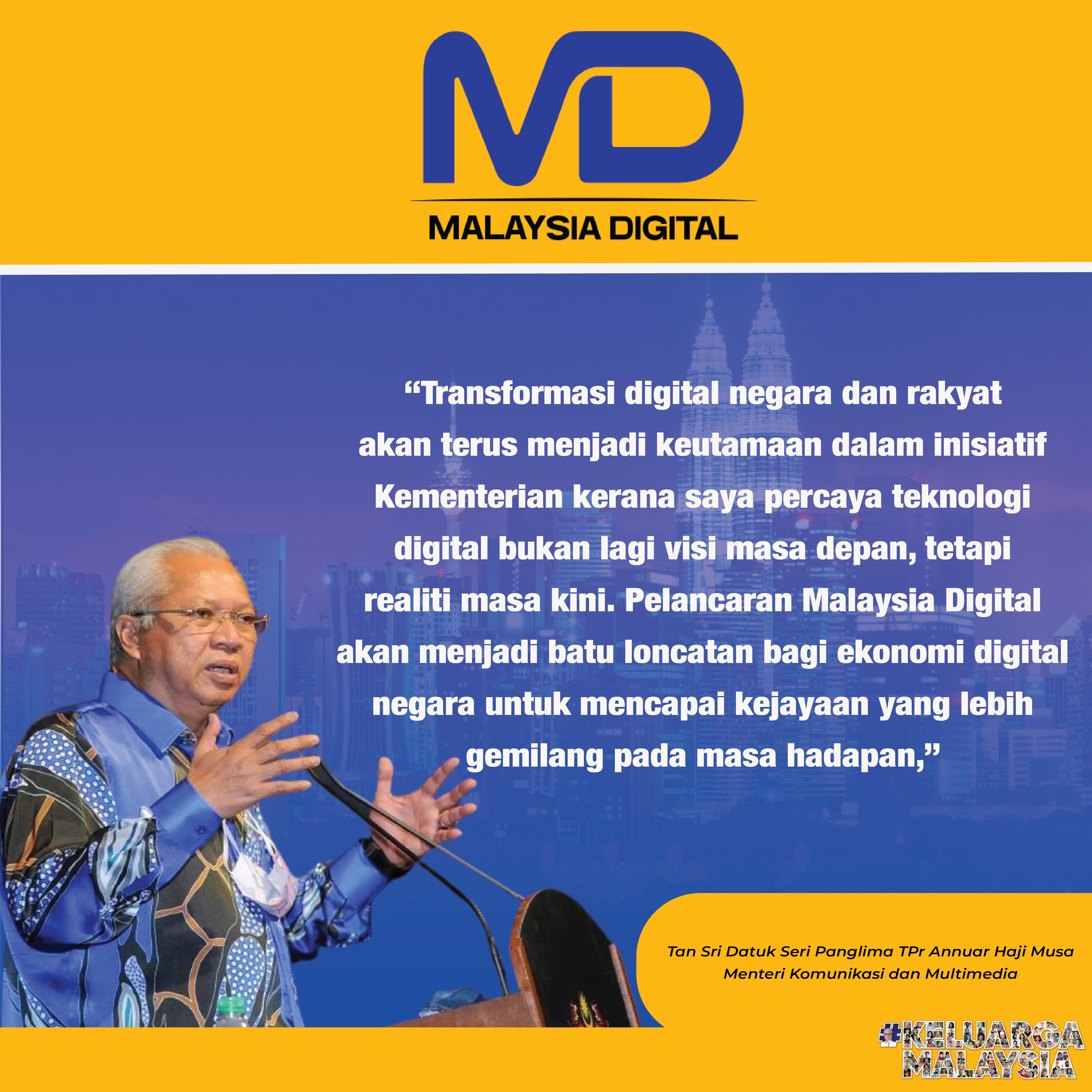 Kerajaan telah membangunkan Malaysia Digital (MD), satu inisiatif untuk mempercepatkan pertumbuhan ekonomi digital negara, didorong oleh tiga prinsip utama — fleksibiliti, ketangkasan dan perkaitan.